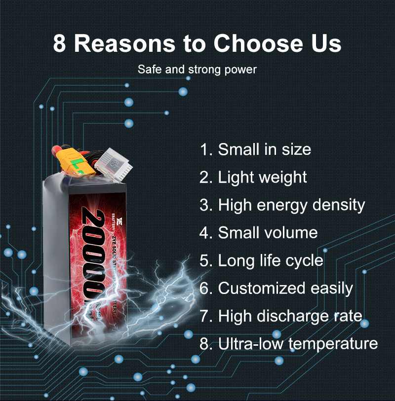 Podpora za stranke: 24/7 predprodaje in storitev po prodaji, kar zagotavlja, da boste dobili najboljšo podporo za vašolipo baterija 20000mah 22000mah 3s4s6s 20C 25C baterije z visoko stopnjo praznjenja potrebe lipo baterij.