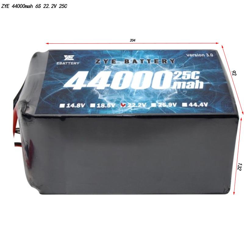 | 44000mAh | 6S1P (22.2V) | 4990G (± 10G) | 204*92*132 mm | 976.8Wh | 25c 1100a | 50c 2200a |