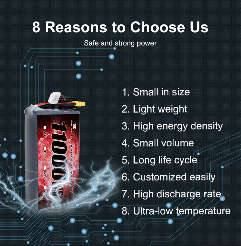 Visokokakovostni izdelki: Naše baterije so prepoznavne po vrhunski tehnologiji in zmogljivosti, vključno z našimipolprevodniška baterija proizvajalec polprevodniška baterija visoke energijske gostote 11000 mah 5c 10c 3s6s baterije za drone, zasnovan tako, da ustreza visokim zahtevam aplikacij za drone.